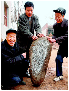 張步高發現一塊石頭上面刻著怪字的消息不脛而走,周圍的鄉黨紛紛前來看稀奇,可就是沒有一個人能認得這怪字。為了弄清這塊石頭的來龍去脈,特別是它上面字的含義,張步高老人說他半年來,請了不少行家里手,甚至別人特意介紹的專家教授,可到目前,還是沒有人能說出個所以然來。張老說盡快揭開蒙在這石頭上的神秘面紗,已成為自己的一塊心病,希望有關部門和專家能和他聯系,把被人們傳得沸沸揚揚的石頭解釋得明明白白,真實可信。(記者 張波文/圖)