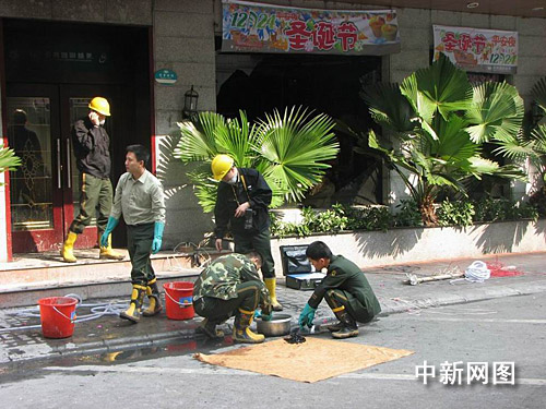 記者在現場看到,火災現場已被警方封鎖,甚至在距離現場數百米遠的路口警方也設置了警戒崗。發生火災的名典西餐廳一片狼藉,西餐廳二樓的玻璃墻已全部破碎,餐廳里的沙發、桌子大部分被燒壞。此次火災約三百三十平方米。