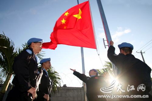 在維和期間,張偉保除了擔(dān)任防暴隊(duì)一分隊(duì)指導(dǎo)員,而且還是國旗手。今年2月1日,防暴隊(duì)去北京學(xué)習(xí)時(shí),觀摩了國旗護(hù)衛(wèi)隊(duì)升國旗的全過程,之后有幸將2月1日在天安門升起的國旗帶到海地。在防暴隊(duì)擔(dān)任國旗手的張偉保,在每個(gè)月的第一天以及國內(nèi)的重要節(jié)日里,他都要和兩名護(hù)旗兵一起,將中國國旗升起在海地的藍(lán)天下。“第一次將國旗在海地升起時(shí),心里有種說不出的激動(dòng)。”張偉保說。