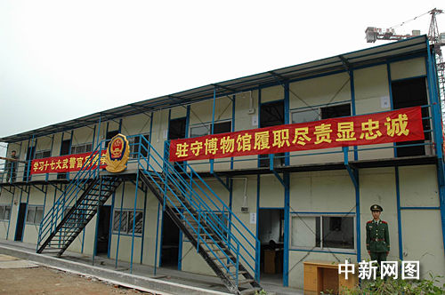 記者在現場看到,官兵們臨時駐扎的營區條件簡陋。一名警官表示,為了“南海一號”安全,再苦再累都值得。營房前懸掛著的紅色標語表達著官兵的意志:駐守博物館履職盡責顯忠誠。