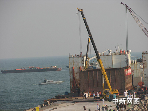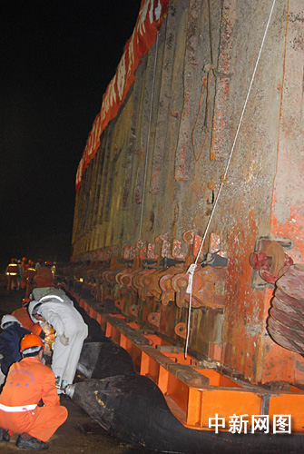 據介紹,今天適逢一個月內潮位最高之日,本最有利于“南海一號”登陸。經過今晚約兩個小時的努力,“南海一號”在甲板上被拖移了約十六米,但離碼頭尚有約八米。