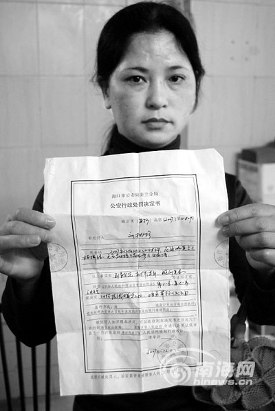 劉女士的“行政處罰決定書”這樣寫著,2007年12月21日22時(shí)許,在海口美蘭區(qū)板橋路無名麻將館內(nèi)參與賭博,根據(jù)治安管理處罰法規(guī)定,對(duì)你收繳賭資二十元,治安罰款伍百元。