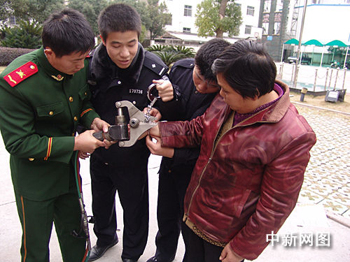 中新網溫嶺12月28日電(記者 柴燕菲 通訊員 陶文波 彭軍偉) 12月27日下午,溫嶺市新河派出所的民警帶著一位中年婦女來到溫嶺消防大隊救助,原來該中年婦女的右手腕被手拷牢牢拷住,民警用鑰匙以及其它方法嘗試都無法打開。最后,在大家齊心協力的幫助下,巧妙的利用手動液壓剪、鉗子等方法成功解救出了手腕。