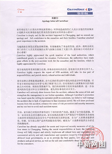 今天,家樂福方面公開了一份致歉信,信中說,“家樂福對發生在重慶的事故深表痛心,對事故造成的傷亡人員以及他們的家屬表示道歉并對此事故和給他們帶來的傷害深切哀悼和衷心慰問!”