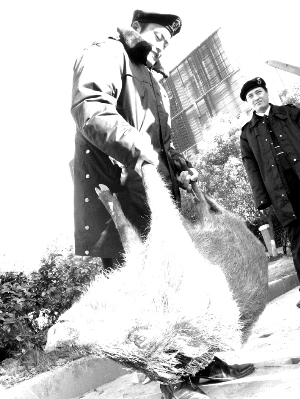 去年11月中旬,一頭大野豬帶領10多頭小野豬,穿過籃球場北面柵欄,跑到10幢那里,被屈起運發現,當時他跟另外一個同事在巡邏,手上沒帶鐵棍,兩人不敢上前追,只是用手電筒照了照,這群野豬怕人,跑了。12月28日凌晨一點左右,屈起運又在籃球場碰到一頭100多斤的野豬。
