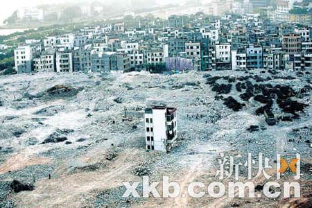 曾經(jīng)密密麻麻蓋滿了“握手樓”的獵德村,迅速成為一片空曠的大工地,村屋幾被拆完。然而,殘?jiān)珨啾谥校粭潣欠恳廊宦柫,從高處看去很是顯眼。