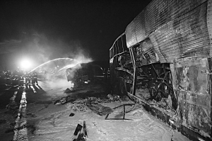 大火撲滅后,油罐車的汽油泄漏,消防員從各個方向向油罐車噴水。兩名消防員爬上油罐頂,從頂口向里注水,稀釋汽油。“空氣中彌漫著濃烈的汽油味道。”