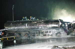 昨日21時許,通順路順義段李橋鎮聚順通加油站附近,一輛油罐車與一輛東風集裝箱貨車相撞,油罐車起火報廢。大火威脅加油站安全,北京市消防總隊調集朝陽、順義、通州等區5個消防中隊趕往現場滅火。零時左右,火被撲滅,加油站沒有受到太大影響。油罐車司機失蹤,生死不明。
