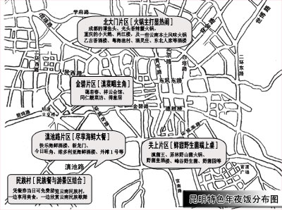 北大門區(qū)域的品牌火鍋?zhàn)顬榧,成都的譚魚頭、光頭香辣蟹火鍋,重慶的小天鵝、兩江樓檔次高、口感好、環(huán)境好、服務(wù)好。此外,這個(gè)區(qū)域的酒樓風(fēng)格最豐富,乙古香酒樓(滇味精品家宴)、粵海漁村(老牌平價(jià)海鮮酒樓)、酒靈莊(騰沖風(fēng)味)、東北人家(東北風(fēng)味)等等,不同的風(fēng)味,可讓你吃不膩。10人桌收費(fèi)標(biāo)準(zhǔn)視實(shí)際菜品確定,人均消費(fèi)30-80元。