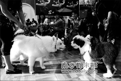 現場一下子要請來幾十名狗狗,真不容易。狗主們各顯神通,有的拿包包當工具,有的直接抱進來的,訓練有素的狗狗則直接跟在主人后面閃亮登場了。它們在現場看到這么多同類,都好奇地互相打量,小心翼翼地上前用鼻子嗅嗅,算是問個安了。