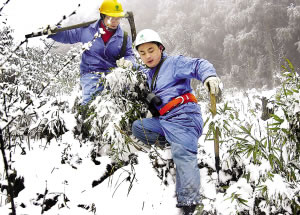 渝東南連續(xù)3日普降大雪,武隆仙女山等地積雪超過10厘米,部分電力設(shè)施出現(xiàn)覆冰現(xiàn)象。一旦冰塊增多,輸電線的電阻增加減少輸電能力,電線還容易下垂斷裂。一旦斷裂,不僅這些區(qū)縣將出現(xiàn)大面積停電,進(jìn)出主城的電力也會(huì)受到影響。為了保證電力的正常供應(yīng),一支24人的“打冰隊(duì)”每天都在巡查打冰。