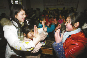 晚6時,東洲春蕾希望小學。住校的孩子們都已吃過晚飯,但停了一天的電依然沒來。一陣哨子聲響過,同學們又回到教室。一年級2班,數學老師姚川杰正和孩子們做游戲,教大家拍手和跺腳取暖。“如果感到快樂你就拍拍手!”跟著老師的節奏,孩子們的巴掌聲響成一片。