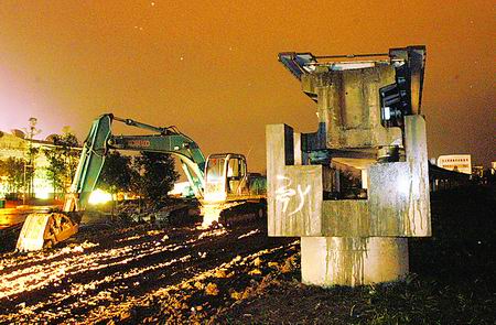 晚上7時,青城山鎮雪花紛飛,寒冷而靜謐,在發生斷裂的磁懸浮軌道處,記者赫然發現,相比于前晚,3個殘缺的水泥柱依舊無人過問,軌道旁卻多出一輛挖掘機,安靜地停在那里,而前晚屹立在軌道旁的一排翠竹在相隔一天后被全部拔起,分作兩堆躺在地上,周圍還有倒塌一地的磚塊,周圍平整的泥土有明顯的被鏟過的痕跡。由于天上飄著雪,極少有路人從此通行。當記者向離此不到50米遠的青城豪生國際酒店的值班崗亭打聽情況時,一位站在傘下執勤的酒店護衛人員表示,他是當天下午3點過上班的,挖掘機何時出現在那里他一點不知道,也不清楚屬于何方。
