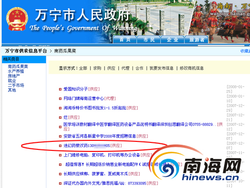 記者打開萬寧市人民政府網站時,在首頁上點擊進入萬寧信息供應平臺,在該平臺上的“南藥瓜果”欄目的第六條信息中,記者發(fā)現(xiàn)“迷幻藥蒙汗藥13082***905[供應]”的信息。點擊進入時,里面的內容非常詳細。不但介紹了香港GHB粉、香煙型迷藥、噴霧型迷藥等各類迷幻藥蒙汗藥的成分、價錢、服用方法,還標明了服用后的反應。該信息還稱,“誠信交易,貨真價實,無效退款!!!嚴禁一切詐騙分子復制本公司廣告!!!本公司本著信譽第一,效果保證,誠信經營的原則,真誠與全國各地朋友長期合作,真正需要貨的朋友,請注意,提防騙子用低廉價格寄假貨,來騙取你們急需等著用貨的人,請不要貪小便宜而上當,效果那么好,能賣你兩三百元,四五百元嗎?我們的藥雖然比別人貴了點,但效果絕對保證達到我們廣告所說那種效果,貨到你們當?shù)啬阍囈幌拢憔椭牢覀兊乃幮Ш托抛u。本公司奉勸那些網絡騙子。不要再騙那些真的需要藥的朋友了,都是在外面混的人。少做點讓人罵的事。也勸沒有貨的商家,我這里有大量的貨可以批發(fā)給你們,你找不到進貨渠道。可以在我這里拿,你要的量大。我們可以談。批發(fā)的價錢可以給你去賣,并且比你騙別人的那點錢,賺得多,誠信經營生意越做越大,欺詐客戶生意越做越小。歡迎來電洽談合作。”