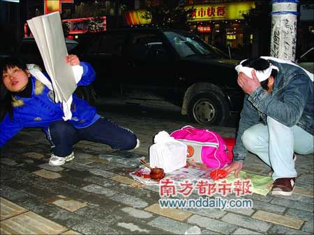 記者趕到時,只見一男一女跪在地上,他們頭上系著白布,旁邊點著蠟燭,放著骨灰盒,燒著紙錢。圍觀的市民被這一場景感動,紛紛慷慨解囊。記者詢問時,女子一直支支吾吾并抽泣。記者拍照時,女子用石塊砸向記者。男子對記者說:“這本來就是騙錢!” (記者 馬小六)