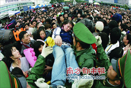 廣州火車(chē)站廣場(chǎng),一位暈倒的旅客被接力式從等待進(jìn)站的人群中送出,武警隨后將她抬至正對(duì)著火車(chē)站進(jìn)站大廳的臨時(shí)醫(yī)療中心。張駿攝