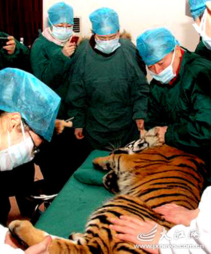 醫生先給關在特制鐵籠內的小華南虎進行了預麻醉,讓其進入安靜狀態。華南虎被抬上了手術臺時,一個意外情況出現了,它的呼吸規律出現異常。老虎皮毛太厚,監護儀根本感應不了。醫生只好拿來聽診器聽老虎的心音,才慢慢捕捉到華南虎對麻醉藥物的反應。借助聽診器,才緩緩給老虎注入麻醉藥物,直到其昏迷。