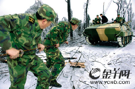 如位于位于粵湘交界處廣東第一峰大東山半山腰的星子鎮潭嶺村,通往山下的唯一一條12公里水泥路結上了十多厘米厚的冰層,4000多村民被困在山上,由于停電,碾米機無法運轉,村民的籌備糧很快吃光,連喂豬的飼料都要吃光了,已經陷入絕境。得悉這種情況后,廣州軍區某部緊急派出官兵和兩輛裝甲運輸車以及推土機、大卡車等奔赴受災山區,一路上,領導帶頭揮舞榔頭、鐵鏟奮力破冰開路,協助連州當地政府把一批大米、棉被、柴油碾米機等救援物資迅速送到受困群眾手中。(記者 覃明章 記者 黃瓊 尹政軍 通訊員 楊小剛 鄒庭松 陳楚然 韓志軍/攝影)