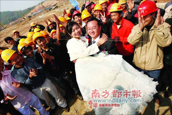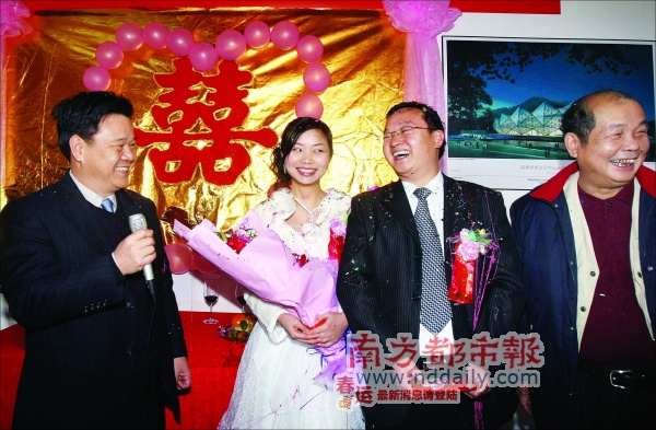 因?yàn)榇筮\(yùn)會(huì)建設(shè)工程工期緊,這個(gè)春節(jié),來(lái)自深圳建筑工務(wù)署大運(yùn)工程管理處的工程師高輝,昨日把原計(jì)劃在老家江西舉辦的終身大事,搬到了大運(yùn)會(huì)的施工現(xiàn)場(chǎng)。而深圳市兩位副市長(zhǎng)呂銳鋒、梁道行在工地上為一對(duì)新人做了證婚人。