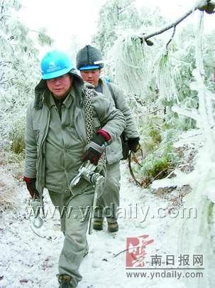 據曲靖供電公司總經理姜洪東介紹,轄區整個輸電網絡設計是按照30年一遇的冰凍災害設計,覆冰厚度設計是按照5-20毫米厚度,現在實地察看以后,覆冰厚度局部達到40毫米以上。記者獲悉,沾益縣多個片區鄉村,播樂鄉水田村,白水鎮哈拉益片區等地約2900余戶停電,市縣相關電力公司正努力組織人員進行搶修。
