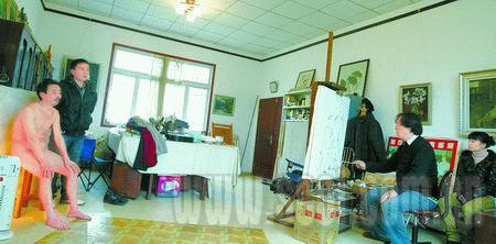 下午5時,畫室里一臺柜式空調和一個1500瓦的電熱器已經給60來平米的畫室加熱了兩個小時。準備就緒,萬老師開始調試畫筆和觀看角度。楊曉勇忙著把唯一的一臺電熱器放在父親一側,然后靜靜地站在父親身旁。而父親完全沒把現場的三個男人和“編外”女學生放在眼里,微笑著脫掉粗布外套,再一把翻起其余的毛線衣和內衣,頭一縮就全脫了下來。楊師傅一邊說一邊熟練地去掉內外褲,時間不過5秒鐘。看著身旁一絲不掛的父親,不用脫衣(作品需要)的楊曉勇眼睛一紅,迅速將頭仰向天花板,生怕眼淚掉下來。畫家被眼前父子倆的舉動感動了,他拿起了畫筆。一筆一畫,現實中的楊師傅父子走進了畫布。
