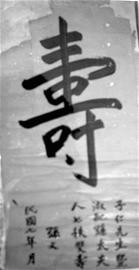 昨日上午,在綿陽市一位收藏者家中,記者見到其新近收藏的一件賀壽書法珍品:一張大紅榜紙(朝廷發(fā)金榜用紙)上,斗大的繁體 “壽”字,勻稱、飽滿、遒勁,十分工整。落款清楚,其中單獨(dú)成行的“孫文”兩字非常醒目(右圖)。