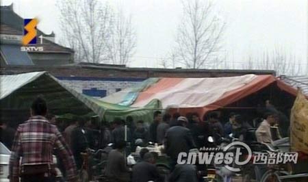 上午11點,周至縣二曲鎮張家村的廟會現場人山人海,非常熱鬧。會場北邊的一排簡易帳篷前更是人氣旺盛,記者走近一看,發現每個帳篷里都聚集著四五十人。臺上的莊家正搖著骰子,臺下的人正紛紛地下著賭注。