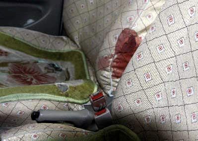 昨天中午,事發汽車已經被拖入奉賢公安分局停車場。車輛左前門車窗玻璃已經完全破碎,門框上依然留有黑色物體擊打后留下的痕跡。副駕駛座左側座椅和靠背的交界處,一攤手掌大小的紅色血跡滲入靠墊,車內物體雜亂堆放著。