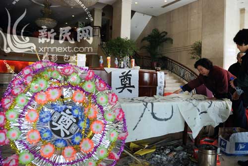 3月11日上午9點30分左右,新民網記者在中亞飯店看到,跳樓男子的家人仍聚集在中亞飯店的大堂內,中亞飯店大堂內的顯著位置已經設有靈堂,大堂內擺放著祭奠用的臺子,祭臺旁邊擺放著2個花圈,死者的親人在祭臺前焚燒紙祭奠死者。