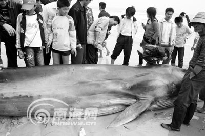 11日上午,記者在潮灘港海灘上見到了這條鯨魚,它軀體龐大,全身呈黑青色。省海洋與漁業(yè)廳、文昌市海洋與漁業(yè)局的有關(guān)專家,以及錦山鎮(zhèn)政府的工作人員已經(jīng)趕到現(xiàn)場(chǎng)。很多居民沒有見過鯨魚,紛紛前去觀看。據(jù)介紹,死亡的鯨魚是一頭須鯨,鯨魚頭寬1.3米,身長(zhǎng)7.6米,重4500斤,屬幼鯨。