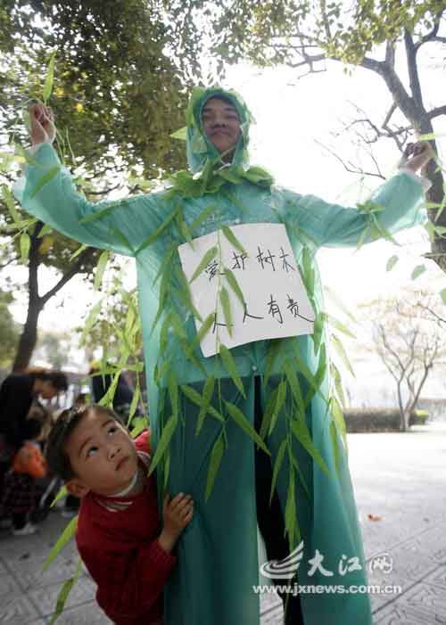 據了解,這群青年志愿者希望通過行為藝術,呼吁人們保護植物,愛護環境。他們從頭到腳用綠色塑料雨衣和塑料花、塑料枝葉裝扮成大樹和花朵。組織者告訴記者,全球環境變得越來越惡劣,如果大家不愛護樹木,將來人類只能用塑料花、塑料樹來替代。(李偉 梁冰 李慧)