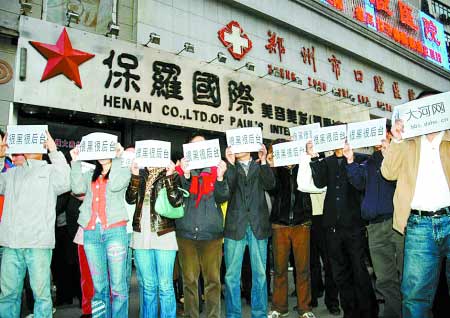 這一群由大河網-大河論壇的網友自發組成的閃客行動,在保羅國際門口舉行抗議活動。他們將寫著“很黑很后臺”的十六開紙舉在頭頂,表示他們對保羅國際的不滿。