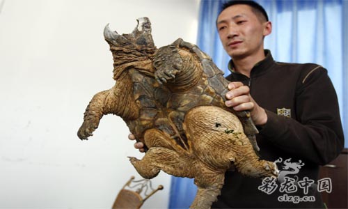 記者隨后從網上查找了一些相關的資料,發(fā)現這個“怪物”有點像麟角鱷龜。“怪物”究竟是不是大鱷龜,還有待于專家的鑒定。