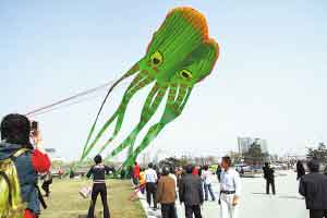 昨天的吉林市世紀(jì)廣場(chǎng),一片草地上慢慢地出現(xiàn)了一個(gè)龐然大物——一只章魚(yú)形狀的巨型風(fēng)箏。幾十個(gè)人忙活著鋪平、布線、貼裝飾物……風(fēng)箏的制作者李景陽(yáng)抬起頭看了看天:“大伙動(dòng)作快點(diǎn),現(xiàn)在的風(fēng)好。”一個(gè)半小時(shí)后,風(fēng)箏鋪好了。