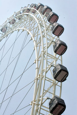 記者在施工現場看到,永樂橋摩天輪的外圈掛滿了黑色廂體,整整48個,施工人員只用了兩天的時間就將它們全部安裝到位。據介紹,在安裝座艙之前,摩天輪就已經通過了抗壓、抗滲、抗折、抗凍等強度試驗,并完成了電力驅動裝置的安裝,前期準備工作一切就緒,座艙運到后立即安裝,所以才如此神速。施工人員告訴記者,座艙是完全透明的,非常漂亮,但為了避免它們在施工過程中受到污染及損壞,才給它們都套上了一個黑色的罩子,以起到保護的作用。