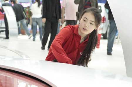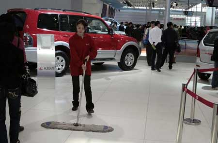 接下來的事情讓攝影者幾乎落淚:清潔妹妹在為輪胎拋光,當時展臺上的模特正在走秀,臺下很多專業(yè)的攝影家們在忘我地拍攝著,她蹲著從底下擦過來的時候,似乎阻擋了他們的創(chuàng)作,一個攝影家為了捕捉到那珍貴的大腿,沖上來,伸出大手拉了她衣服領(lǐng)子一下,她趔趄了一下,然后很不好意思地躲開了,從照片上看,妹妹仍然盡職地擦著車,但緊閉的雙眼、微蹙的眉頭讓人能一眼看出,她心里很不好受,這張楚楚可憐的照片,令人對其頓生同情和憐愛。