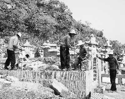 4月27日,記者到這里時(shí),當(dāng)?shù)卣M織村民正在拆墓。墓主體由巖石搭建,墓前有篆刻碑文。碑上有出生日期沒有死亡日期的墓是活人墓,有碑但沒有碑文的則是空墓。村民老黃告訴記者,他正在拆的墓有不少是去年才買的,少的要1萬元左右。