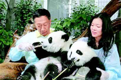 昨日上午,被譽為臺灣首富的臺灣富士康科技集團總裁郭臺銘一行,前往成都大熊貓繁育研究基地參觀,并出資600萬元,一次性終身認養三對大熊貓幼仔。這是成都大熊貓基地自1987年建立以來,收到的最大一筆大熊貓認養資金。
