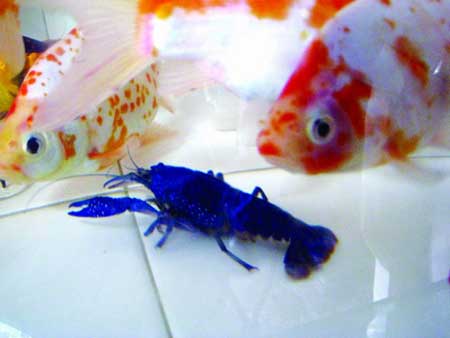 然而,由于這只龍蝦穿著罕見的藍色“盔甲”,與旁邊的紅色龍蝦形成了鮮明的對比。它看起來很活潑,在魚缸中和觀賞魚一起嬉戲,紅的金魚、藍的龍蝦構(gòu)成一幅漂亮的畫面。
