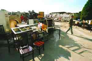 昨日下午3時30分許,修建中的地鐵十號線太陽宮站東北側,冰箱、啤酒箱、柜子、煤氣罐、桌子及一百多張椅子堆放在人行道上,幾名青年男女正倚靠著堆在樹邊的被褥打盹。他們工作的飯店原本有約3000平方米,如今卻成為一片廢墟。