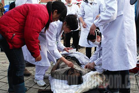 東汽體育館旁邊有一個小學(xué)和一個高中,數(shù)百名學(xué)生遇難。直到下午5點多,體育館前的空地上仍有二十來具尸體被等待運(yùn)走。