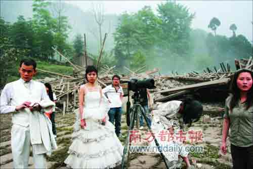 昨天,拍照的攝影師和照片中的新娘接受了本報(bào)記者的電話(huà)采訪。新娘的家人都在震中的汶川縣臥龍鎮(zhèn),至今沒(méi)有任何消息。