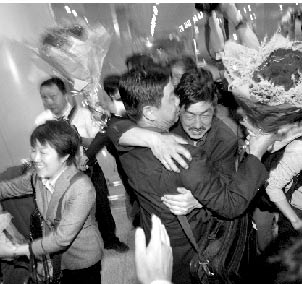 “我們終于活著回來了。”昨晚11點30分,首都1號航站樓,38名北京游客搭乘CZ3904航班平安抵京,迎接他們的是親人激動的擁抱和淚水。據了解,這38名游客是本市首個從四川災區返回的大型旅游團,在成都開往九寨溝的途中,他們遭遇地震受困茂縣,度過了“與世隔絕”的56個小時。