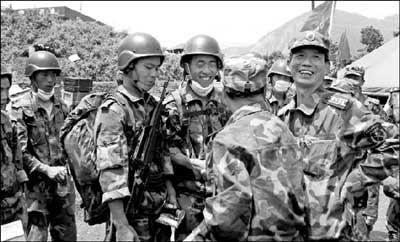 經歷生死考驗的廣州軍區武漢總醫院的兩名專家和空降兵小分隊的成員,緊緊地擁抱在一起。