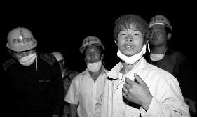 在歡呼和掌聲中,最后將馬元江抬出的上海消防局的消防隊員們,集合在了電視鏡頭前,消防員們盡情地表達著成功的喜悅。這時,一名志愿者將尹春龍推到了記者們的面前。
