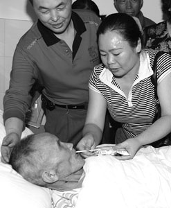 昨日,一志愿者正將牛奶遞到張開富老人嘴邊 記者 孫須 攝