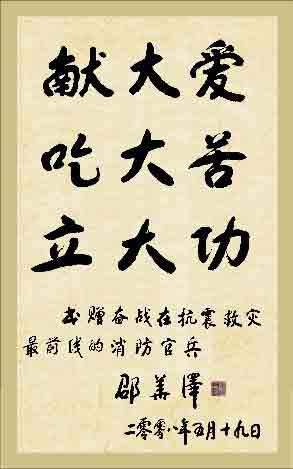 中國(guó)記協(xié)名譽(yù)主席邵華澤題字贊抗震消防官兵(圖)