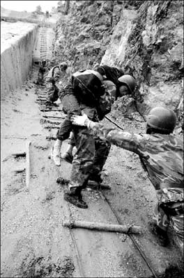 戰(zhàn)士們立即打著手電迎了過(guò)去。近了,越來(lái)越近了,在手電光中,40多個(gè)互相攙扶的人影出現(xiàn)在戰(zhàn)士們面前。戰(zhàn)士們?cè)捯粑绰洌巳褐型鄣仨懫鹨黄蘼暋?zhàn)士們趕忙迎上去將他們扶到洞口,然后每一名受災(zāi)群眾都被一名戰(zhàn)士用保險(xiǎn)繩系在腰間,護(hù)送他們一步一步走下軟梯。