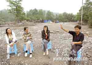 23日下午,采訪車在梁平縣文化鎮一片廢墟前停下!罢垎栁幕行男T谀模俊薄熬驮谶@里!睅酌凶邮种刚诙哑龅膰鷫。他們是文化中心校的老師,廢墟上,工人們正忙著砌圍墻,為今天將正式開始的學校復建工程作準備。