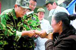 這邊的診斷才剛結(jié)束,那邊又傳來新的情況。有位年過八旬的老人跑過來,請醫(yī)生到帳篷里為自己的女兒診治。將軍二話不說,立即派出心胸外科主任李魯跟著村民坐上自己的越野車,直奔那位村民所住的帳篷。“我們這個流動醫(yī)療隊就是這樣,沿途看到哪里有災(zāi)民居住的帳篷,就會過去詢問是否需要醫(yī)藥,使那些地處偏遠(yuǎn)或行動不便的群眾能夠得到醫(yī)療救助。”